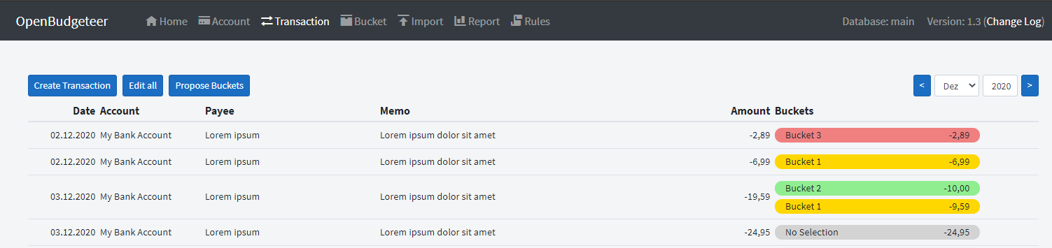 In the final step you assign your Transactions to certain Buckets. Go back to the Transaction Page, edit a Transaction and select an appropriate Bucket. You can also do a mass edit. If a Transaction belongs to more than one Bucket just reduce the assigned amount and you get automatically the option to assign the remaining amount to another Bucket.