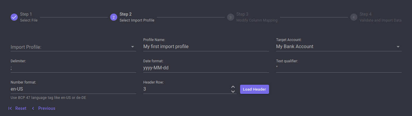 After that, export some Transactions from your Online Banking and import the data using Import Page. At the moment it support CSV files only, but you can individually set the characters for delimiter and text qualifier. The respective settings and other options are shown once the CSV file has been uploaded and you have filled the form of each step.