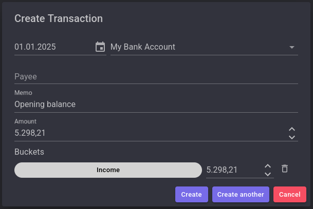 To the define the opening balance, go to Transaction Page and create a new Bank Transaction. Set the date on which you want to start tracking your transactions and enter the balance from that day as amount. Assign this record to the Bucket Income like below.