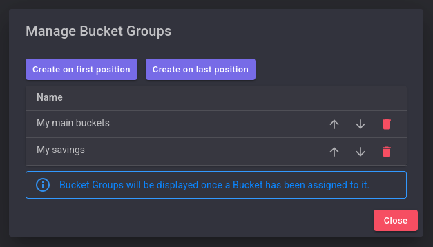 If you close a Bucket it will be marked as Inactive for the upcoming month. This can be only done if the Bucket Balance is 0 to prevent wrong calculations.